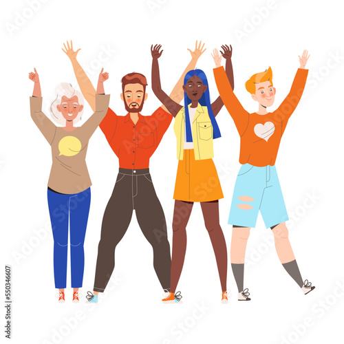 Happy and Rejoicing Group of People Characters Cheering Raising Hands Up Vector Illustration