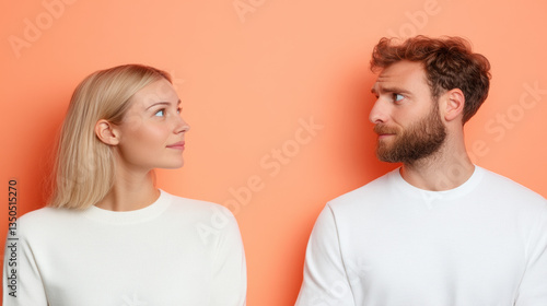 Happy and Sad, A hopeful woman gazes upward while a man appears concerned, captured in a high-fidelity image.
