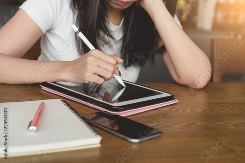Happy and smiling young graphic designer working with modern digital tablet, touch pen at cafe.