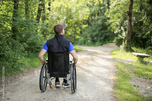 Happy and young disabled or handicapped man sitting on a wheelchair in nature turning wheels on a walking road at a beautiful sunny day