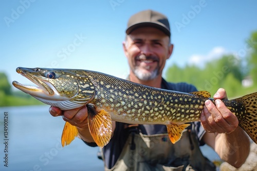 Happy angler enjoys a sunny day fishing, proudly displaying a large pike caught along the river bank