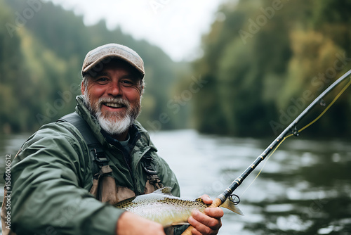 Happy angler with his fresh catch, fishing in a lush river. He smiles, wearing a jacket, hat, and gear. Enjoying a day in nature, surrounded by trees.