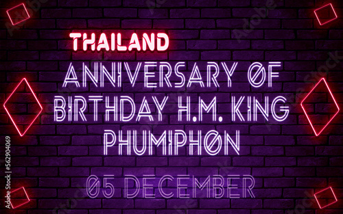 Happy Anniversary of Birthday H.M. King Phumiphon of Thailand, 05 December. World National Days Neon Text Effect on bricks background