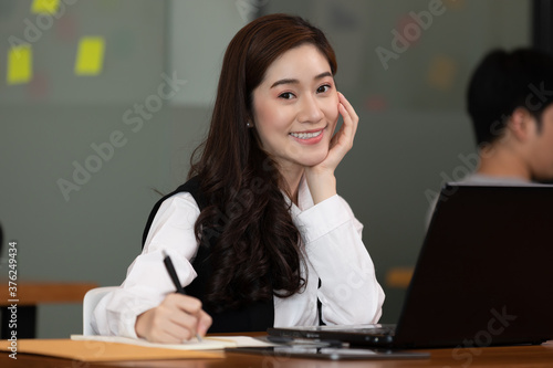 Happy Asian business woman working with laptop and smile looking at camera at modern office or Co-Working Space,Business Startup Concept
