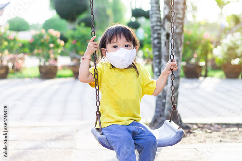Happy Asian child girl wearing a fabric face mask when she playing a toy at the playground. Social Distance.