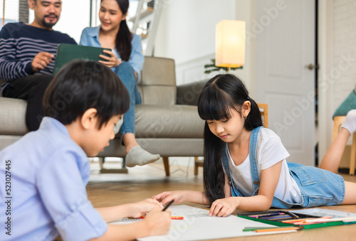 Happy Asian family relaxing on sofa while kid drawing on floor. Little boy girl having fun, friendship between siblings, family leisure time in living room at home.