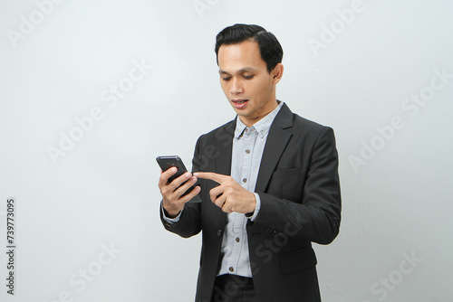 happy asian indonesian business man in suit holding smart phone on isolated background