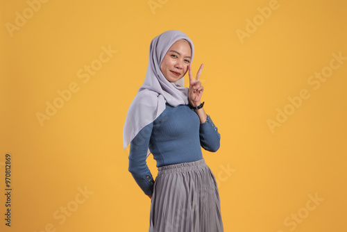 happy asian indonesian muslim woman giving victory sign finger on isolated yellow background