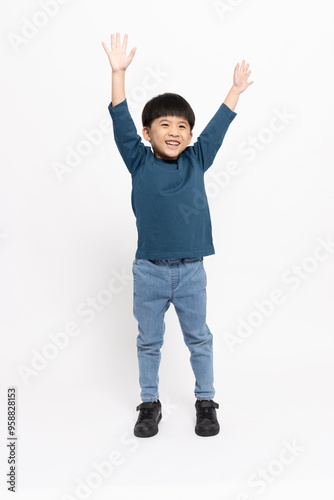 Happy Asian little boy hands up raised arms from happiness isolated on white background, Excited kid winner success concept, Looking at camera and full body composition