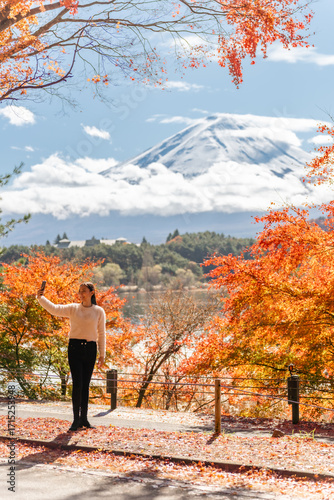 Happy Asian woman travel mountain Fuji, Japan in autumn. Attractive girl using mobile phone taking selfie while travel lake Kawaguchiko and mount Fuji with beautiful red maple tree leaves falling down