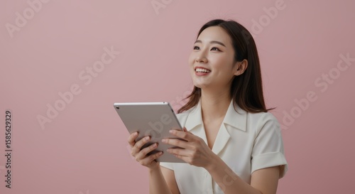 Happy Asian Woman Using Tablet, Smiling and Looking Up
