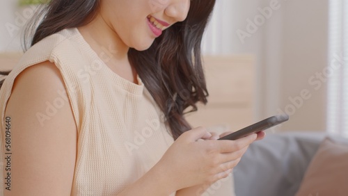 Happy asian young woman smile using smartphone surfing internet and enjoy with social media or online shopping at home. Modern wellness life of cute female looking at mobile phone fun and happiness