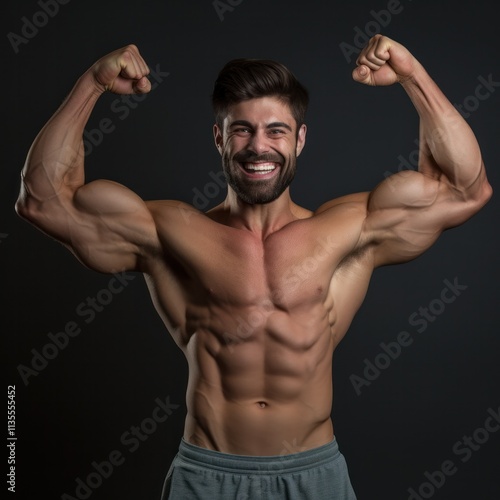 Happy athletic man with a fit physique flexing his muscles