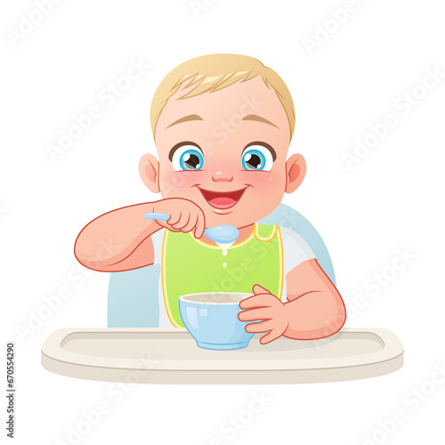 Happy baby in bib eating with spoon. Vector illustration isolated on white background.