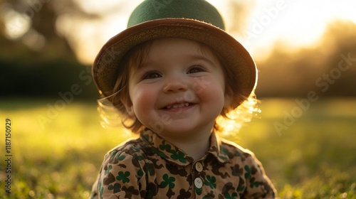 Happy Baby Wearing A Green Hat Outdoors In Sunlight
