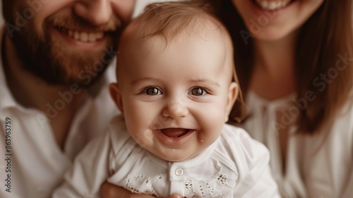 Happy baby with parents, family portrait style, close-up shot. This image captures pure joy and family love with a smiling baby. Ideal for family-related content and emotional storytelling. AI
