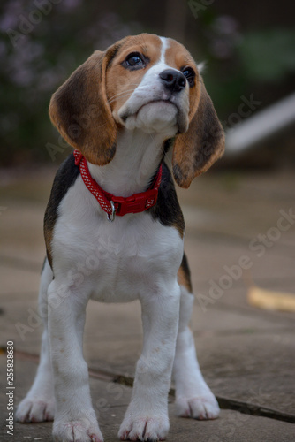 Happy beagle dog having fun at home garden