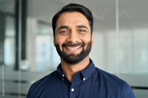 Happy bearded Indian business man leader looking at camera standing in office. Professional smiling businessman manager executive or male worker, entrepreneur headshot face close up portrait.