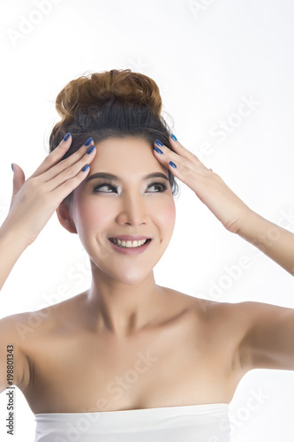 Happy beautiful asian girl with the fresh skin in white background. Expressive facial expressions. Cosmetology and Spa concept.
