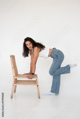 Happy beautiful girl posing with a chair in a new hot look. Wearing blue jeans and white waistcoat