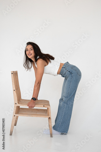 Happy beautiful girl posing with a chair in a new hot look. Wearing blue jeans and white waistcoat