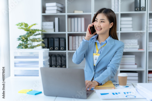 Happy beautiful smiling Asian businesswoman talking on mobile phone while working in office.