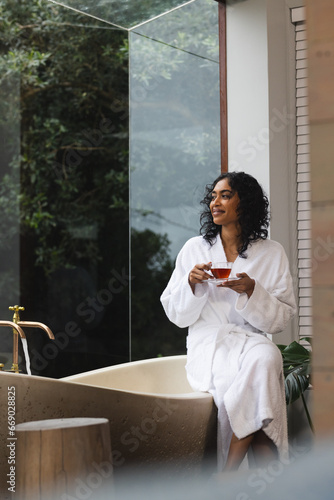 Happy biracial woman in bathrobe sitting on bath with tea and looking out window in sunny bathroom