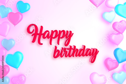 Happy birthday card. Decorative background with heart ballons. 3D rendering. Romantic illustration.