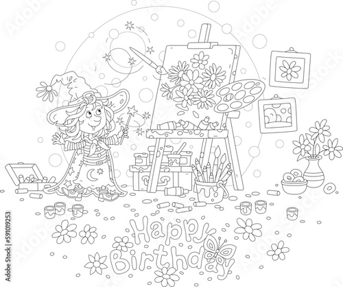 Happy birthday card with a little fairy waving her magic wand and drawing garden flowers on an easel with a flying paintbrush and paints from a palette, vector cartoon
