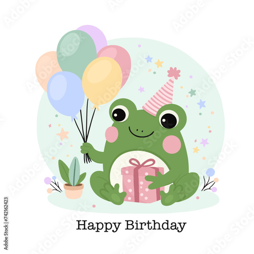 Happy birthday card with giraffe and frog. Vector illustration of a children's greeting card.
