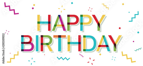 "Happy Birthday" colorful text with confetti