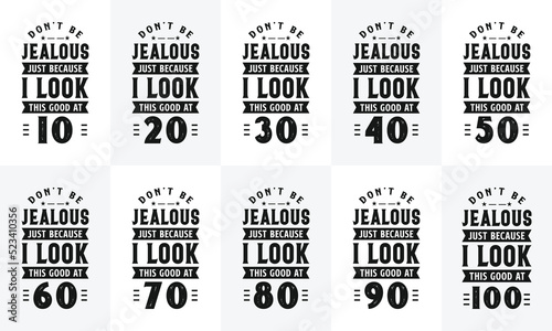 Happy Birthday design bundle. Retro Vintage Birthday Typography bundle. Don't be Jealous just because I look this good at 10, 20, 30, 40, 50, 60, 70, 80, 90, 100