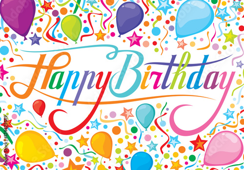 happy birthday design with party streamers, balloons and confetti