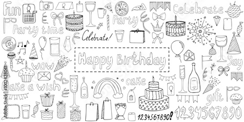 Happy birthday elements doodle big set. Celebration stuff, foods, drinks and phrases. Event elements, birthday cake, candles fireworks. Black lines hand drawn vector doodles. Isolated on white back.