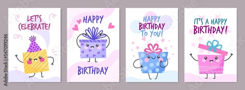 Happy birthday greeting cards. Funny gift boxes characters
