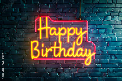 Happy Birthday neon sign glowing against a dark brick wall, creating a vibrant and festive atmosphere