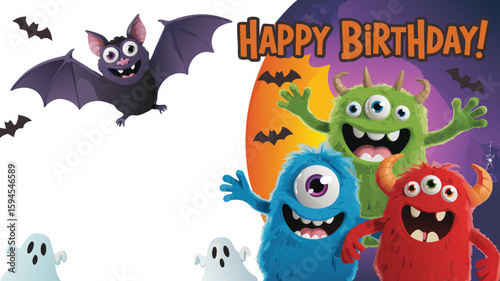 Happy Birthday With Cartoon Monsters, Bats, And Ghosts On Orange and Purple Background