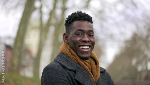 Happy black African man looking at camera smiling portrait during winter season2