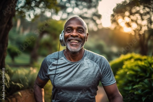 Happy black man running in park with music Smiles and simulations in nature Park and exercise. Senior man. Outdoor runner and exercise motivation.