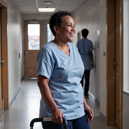 Happy black woman using walking cane in hospital hallway for World Stroke Day
