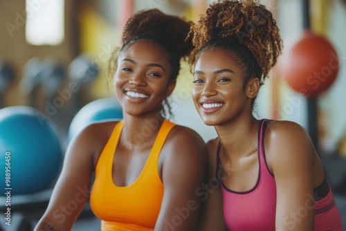 Happy black woman warming up with her female friend during sports training in gym, Generative AI