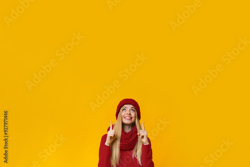 Happy blonde girl in warm clothes showing up with fingers