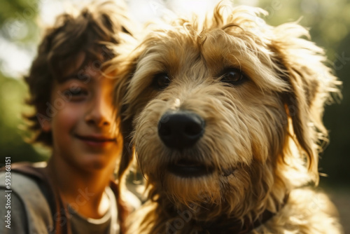Happy boy and his furry friend. Generative AI Fox terrier and its owner