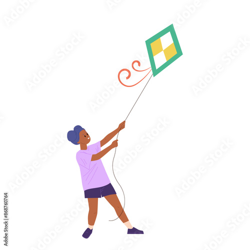 Happy boy child isolated cartoon character playing kite flying high having fun on summer weekends