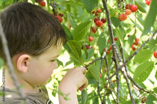 Happy boy eat organic natural healthy cherries in garden. Smiling little boy picks a cherry from a tree in cherry garden