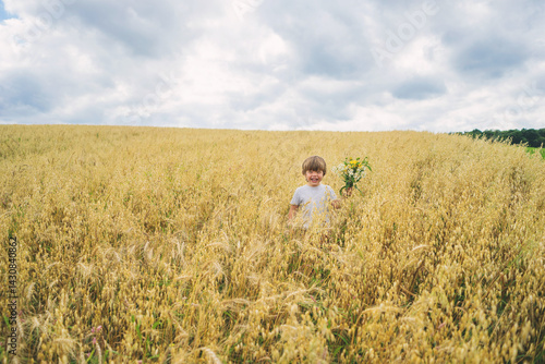 Happy boy standing in a wheat field holding a bunch of freshly picked wildflowers