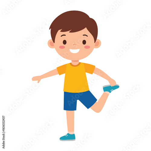 Happy boy stretching, exercising, healthy lifestyle, cartoon illustration.