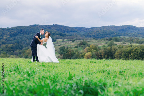 happy bride and groom walking in the field on a sunny day. newly