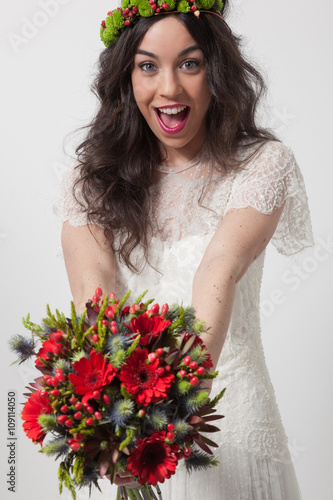 Happy bride holding bouquet