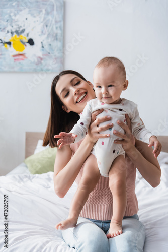 happy brunette woman holding toddler boy in romper while sitting on bed.